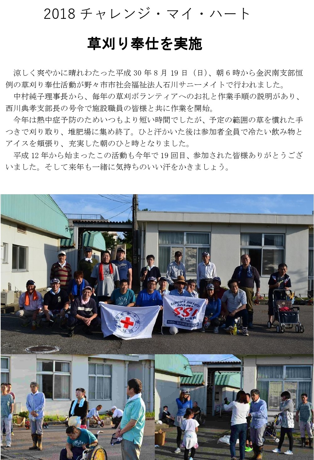 平成29年8月20日(日) 野々市市の社会福祉法人 石川サニーメイトにて「チャレンジ・マイハート」草刈り奉仕が行われました。 本会から、日本赤十字奉仕団・サポート接骨石川(SSI)として参加した会員23名は、やや肌寒さを感じる朝6時に軍手や鎌を持参し現地に集合。西川典孝金沢支部長の挨拶のあと、石川サニーメイト中村純子理事長から感謝と励ましのお言葉を頂き作業を開始し、大きく伸びた草木を約1時間かけ草刈り作業を行いました。 今回で18回目を迎えるこの奉仕作業も、他支部からの有志の応援もあり毎年継続さており、奉仕作業を通して会員同士や施設の方々との交流となっています。この時期の雑草の成長の大きさに自然の力を感じながら作業を終了しました。