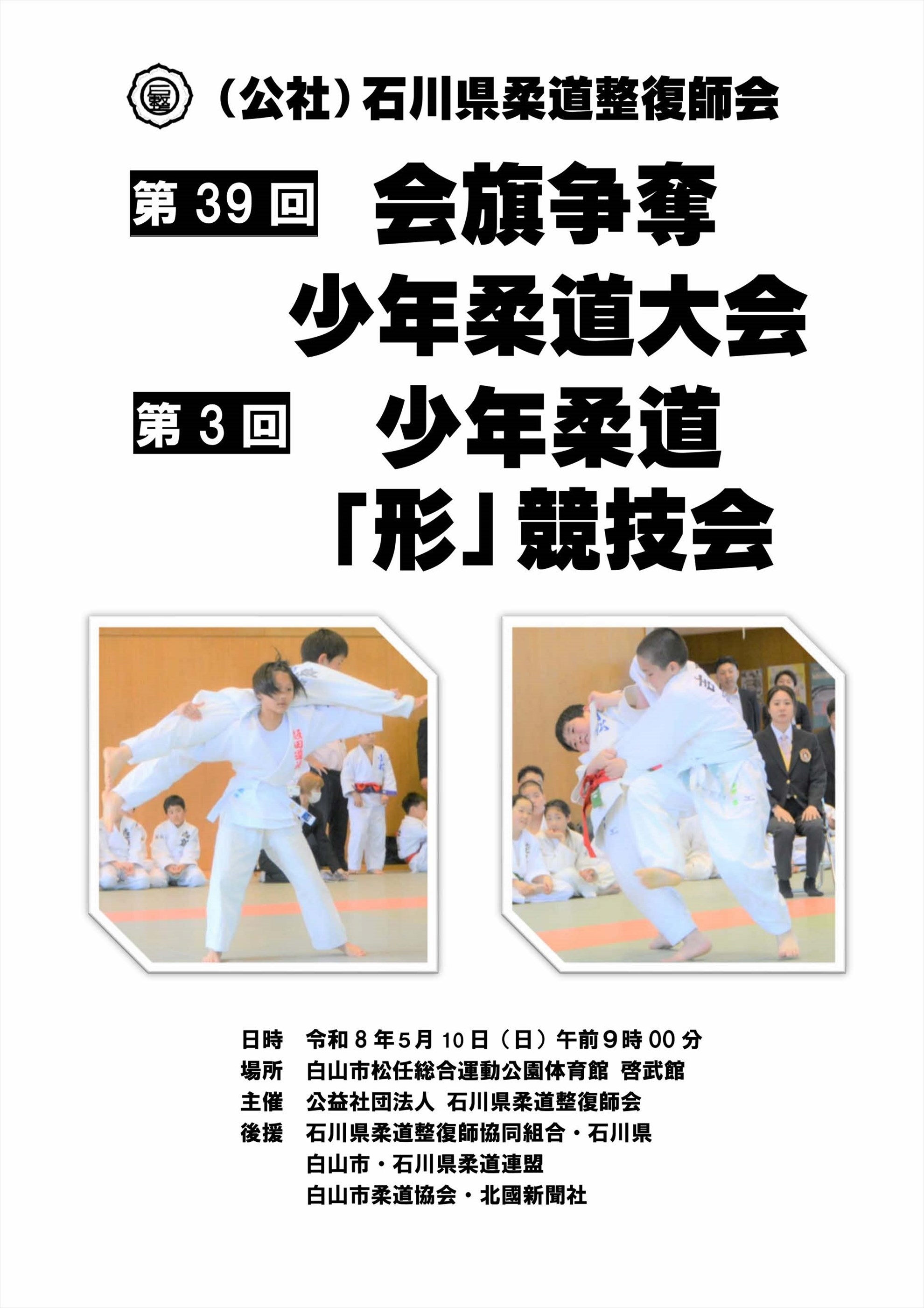 本会主催の第38回会期争奪少年柔道大会・第2回少年柔道形競技会が、令和7年5月11日(日)白山市啓武館において開催されます。出場申し込みのページを掲載しました。出場参加チーム写真、決勝戦動画、総合成績、トーナメント結果などを随時掲載していきます。ぜひご覧ください。